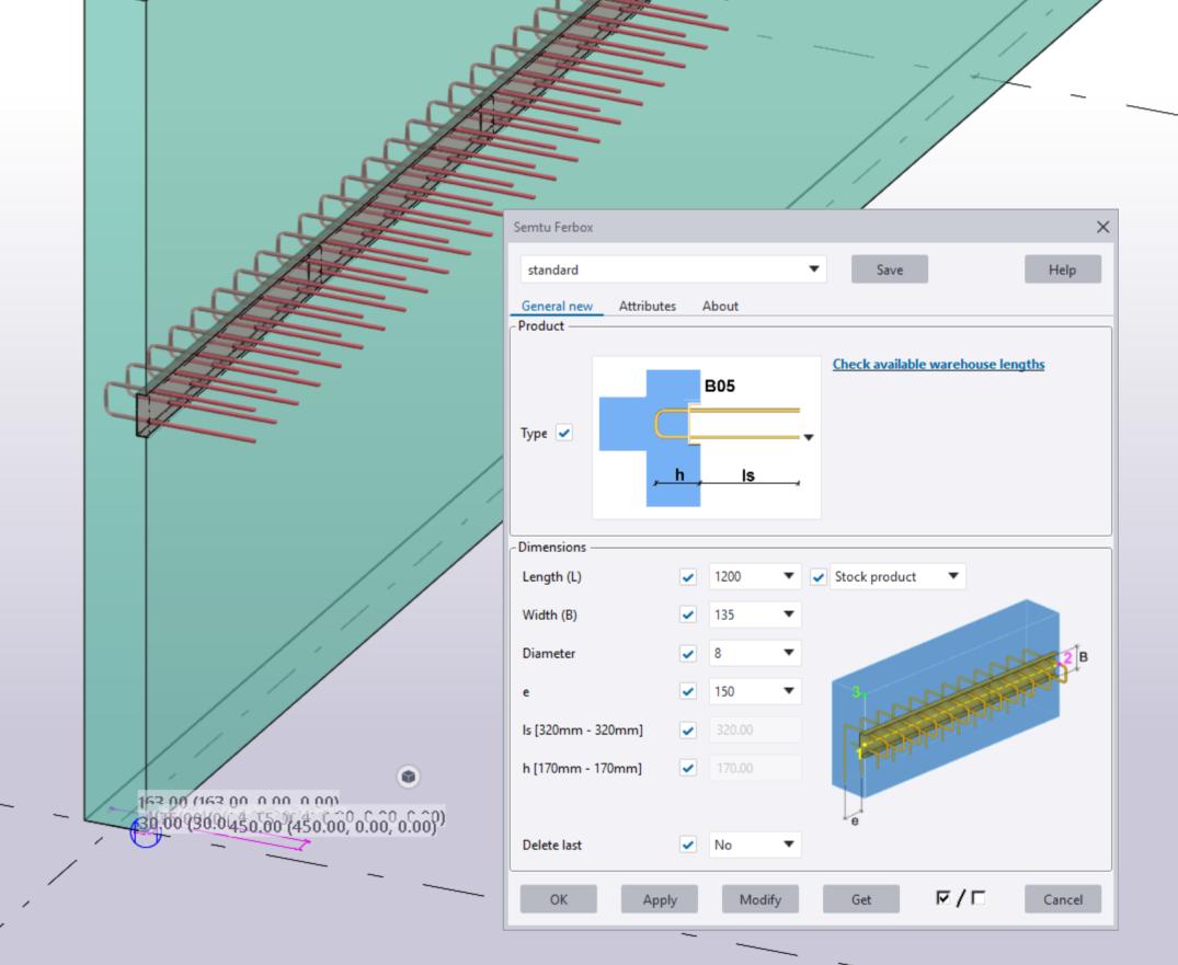 Työkalu sisältää saatavilla olevat mittavariaatiot työsaumaraudoitteelle. Työkalulla tehdyn raudoitteen yksilölliset mittatiedot listautuvat tulostettavaan valutarvikeluetteloon. Tilausvaiheessa ei tarvitse erikseen selvittelyitä oikean tuotteen löytämiseksi.