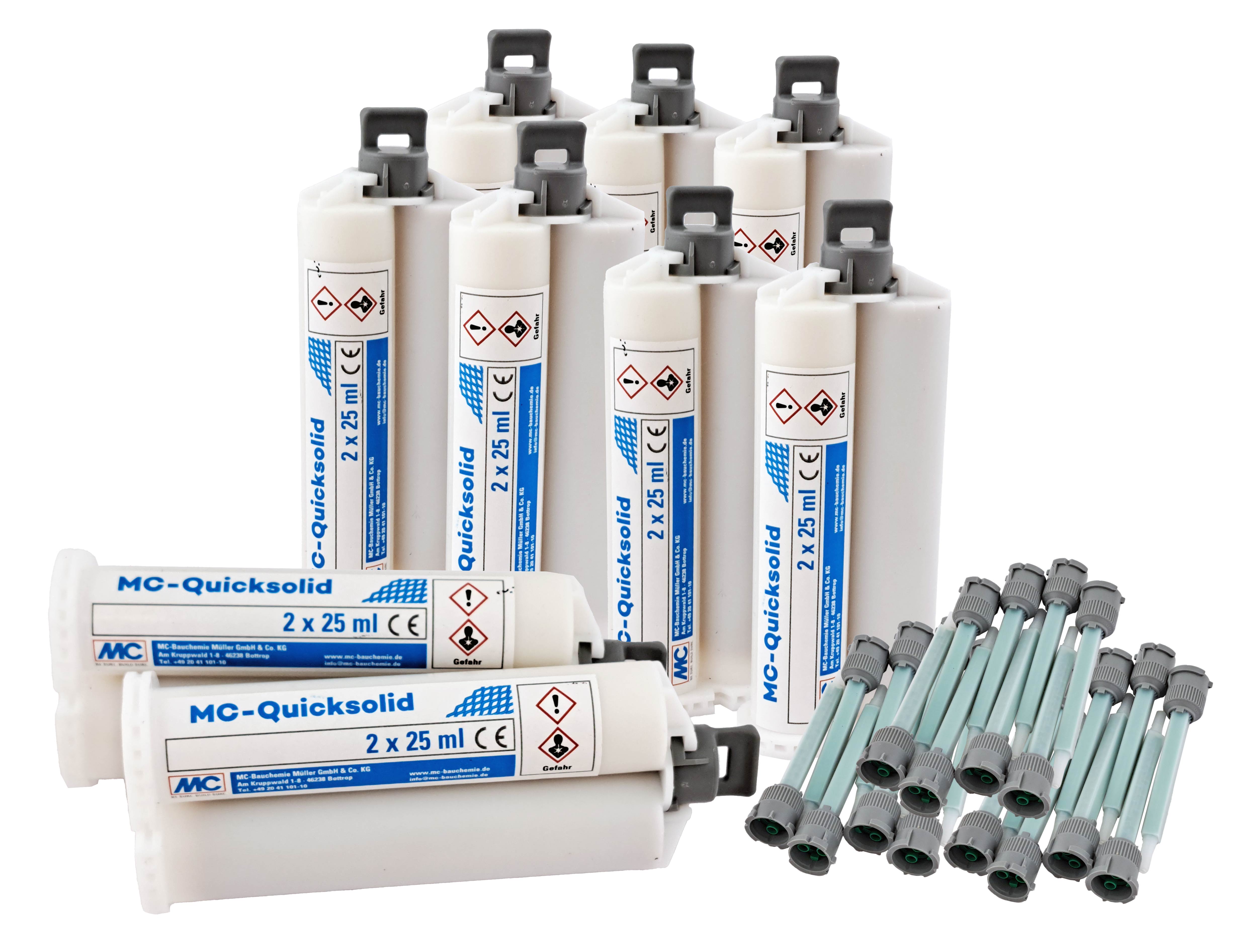 Aseta liimapatruuna puristimeen. Poista liimapatruunan korkki ja tarkista, että molemmat liimakomponentit ovat kunnolla auki ja poista mahdollinen kovettunut materiaali, ja aseta sekoituskärki. Kun avaat uuden liimapatruuunan, suosittelemme, ettet käytä ensimmäistä 3 cm liimapastaa. Kun liimaus on valmis, poista sekoitinkärki ja sulje liimapatruuna korkilla.