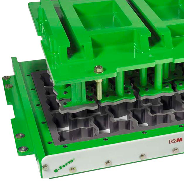 Pitkäikäiset G-Form® KVM-muotit voidaan ottaa käyttöön hyvin lyhyessä ajassa. Muottien kaikki osat on optimoitu minimoimaan ympäristökuormitusta, sillä niissä käytettävät rakenteet ja terässeokset mahdollistavat hyvin pitkän käyttöiän. Lisäksi puristimia ja muottirunkoja voidaan käyttää uudelleen. Muottien paininlevyt on helppo vaihtaa ja ainutlaatuinen jyrsintämenetelmä sallii muottikehikon yksittäisten kennojen erikoissovellukset, kuten erilaiset kennojen seinämien muodot. KVM-muoteilla voi valmistaa kerta toisensa jälkeen tasalaatuisia ja laadukkaita betonituotteita kustannustehokkaasti ja ympäristöystävällisesti ja niiden kulutuskestävyys on omaa luokkaansa.