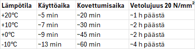 Kovettumisaika pitenee lämpötilan laskiessa: