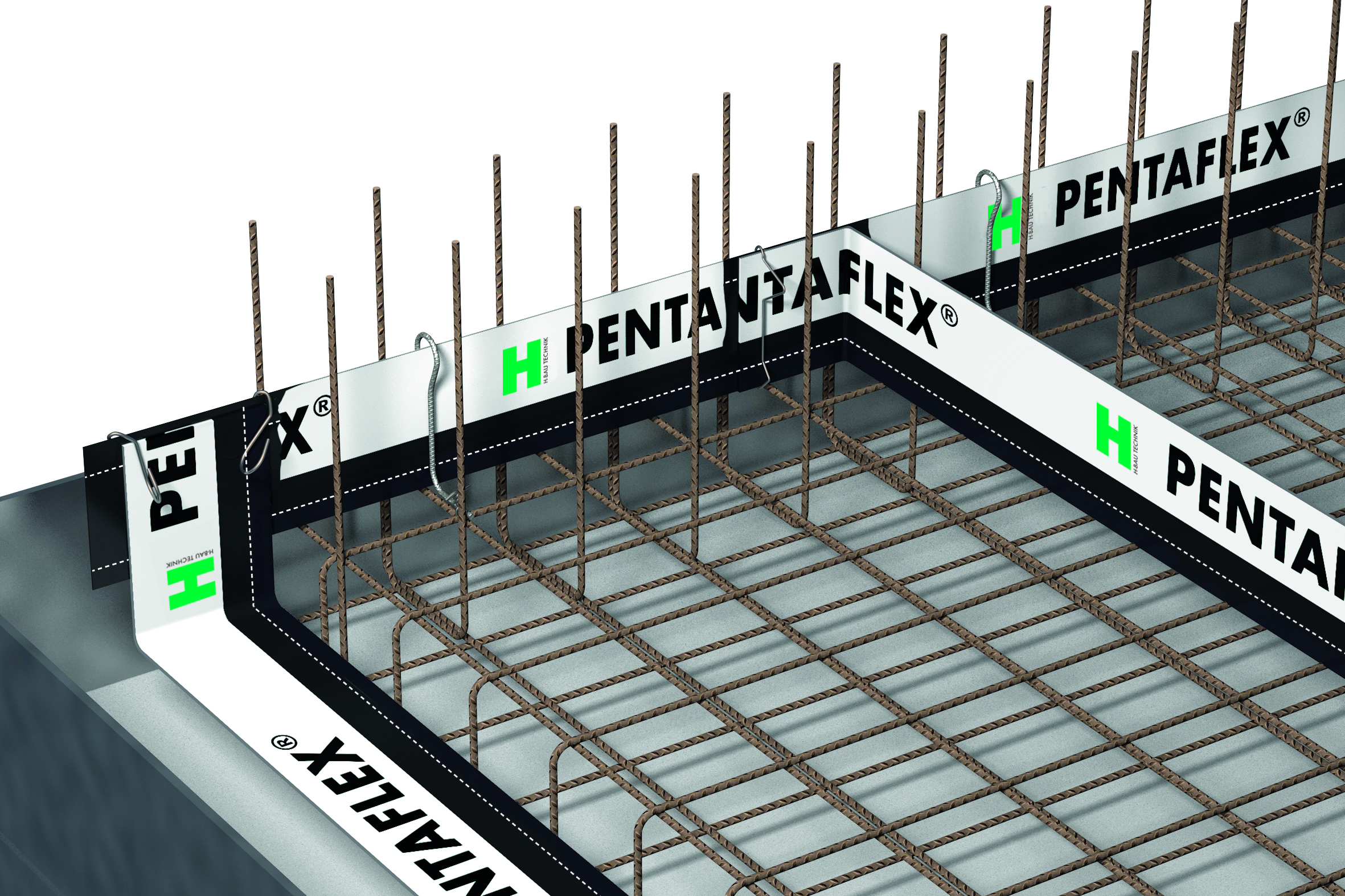 Pentaflex®-tiivistyslevy asennetaan pohjalaatan ja seinän työsaumaan ja sidotaan kannatimesta pohjalaatan raudoitukseen kiinni. Tiivistyslevyä käytetään seinän tai laatan työsaumoissa yleensä Pentaflex® ABS-työsaumaverkkojen kanssa, jolloin tiivistysosa saadaan helposti asennettua puoliksi kummallekin puolelle työsaumaa.
